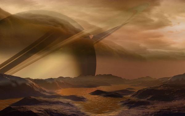 - Vue d’artiste de Titan, un des satellites de Saturne, des briques élémentaires du vivant ont été détectées sur cette lune.