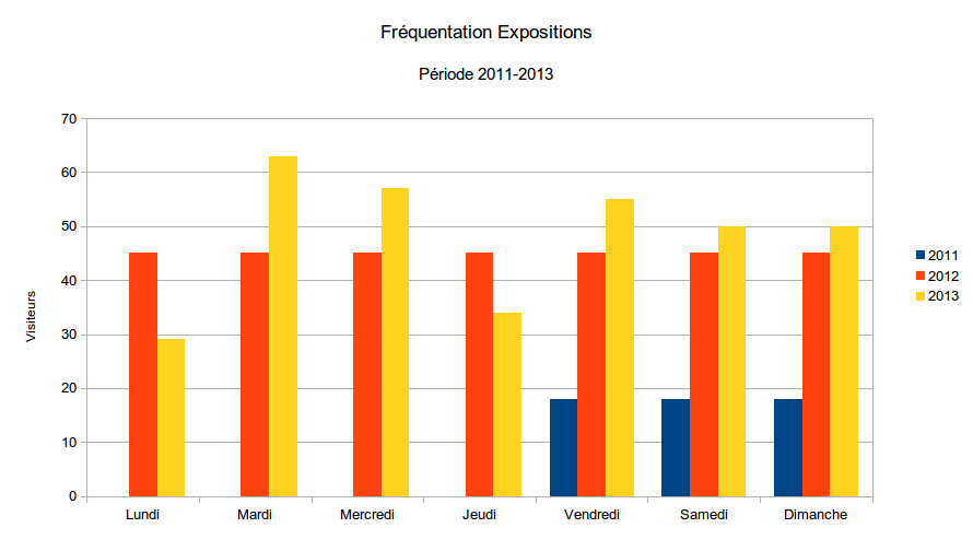 Nous avons inauguré une nouvelle formule en présentant les expositions dans une salle dédiée et en proposant au public 3 visites guidées par jour (une le matin et 2 l’après-midi), gratuites comme le reste du Festival. Ces visites ont été un succès bien au-delà de nos espérances comme l’illustre la fréquentation des expositions en forte hausse. Pour cette édition 2013, nous avons reçu 350 visiteurs sur 7 jours soit une moyenne de 50 visiteurs par jour.