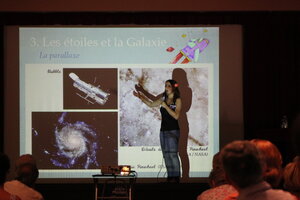 - Le vendredi nous avons eu le plaisir d’accueillir Joanne Breitfelder qui effectue sa thèse au Chili à l’Observatoire Européen Austral (ESO) et au Laboratoire d’Etudes Spatiales et d’Instrumentation en Astrophysique (LESIA). Grâce au soutien de la mairie de Collioure, Joanne a pu venir depuis Strasbourg où elle était en vacances pour passer 4 jours à Collioure, nous aider pour le Festival et présenter l’objet de sa thèse : Mesurer l’Univers, ou comment mesure-t-on les distances dans l’Univers quand on est astronome.