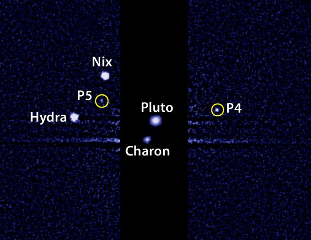 Comme vous pouvez le voir sur les photos, leurs dénominations provisoires sont P4 et P5. Pas très joyeux n’est-ce pas ? En fait, quand un nouveau corps du système solaire est découvert, il reçoit un nom provisoire en attendant que l’Union Astronomique Internationale (UAI) lui attribue un nom officiel qui peut être celui de son découvreur (pour les comètes) ou encore le nom d’un célèbre astronome (pour les astéroïdes ou les cratères sur les planètes).