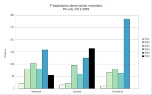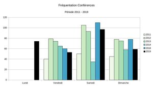 La fréquentation des conférences est cohérente avec les précédentes années. Le pic du samedi est toujours présent. Il est difficile de dire si ce pic est dû à une plus forte disponibilité du public le samedi ou si c’est le thème choisi ce soir (généralement la conférence phare) là qui le cause. La conférence d’ouverture le lundi semble avoir été très bien accueillie, nous essaierons de la renouveler.