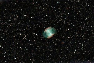 Cette année nous n’avons pu proposer que 2 soirées d’observations (vendredi et samedi) au lieu de 3. Malheureusement, le vendredi soir fut brumeux et couvert ne nous permettant que d’observer Saturne et la Lune pendant 5min. Samedi les cieux furent plus cléments. En plus des observations "classiques", nous avons avons pu profiter du télescope Stellina de W. Salies permettant des observations collectives autour d’une tablette numérique. Le principal avantage étant de pouvoir voir observer en couleur des objets du ciel profond (telle la nébuleuse M27 ci-dessous), au lieu de les voir sous la forme d’une tache floue grisâtre dans un télescope classique.