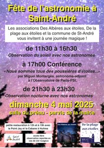Ce dimanche 4 mai, notre président, Miguel Montargès, donnera une conférence "Nous sommes tous des poussières d’étoiles...", à la salle du Préau à St André, à l’invitation de l’association des Albères aux Étoiles. Elle sera précédée et suivie d’observations du Soleil puis du ciel nocturne.