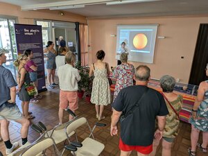 En cette année de maximum d’activité (qui a lieu tous les 11 ans), le Soleil était à l’honneur tous les jours grâce des observations retransmises sur écran de projection. Le samedi et le dimanche, deux éruptions ont été commentées en direct par notre conférencière Carine Briand.